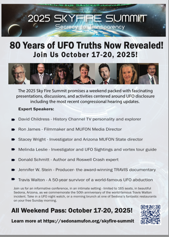 Sedona, AZ — Jennifer Stein, conference chair, is inviting the public to come by and experience the world of UFO secrets and revelations–any time this weekend. Sedona’s Ron James will screen his film, Accidental Truth, at 7 pm on Friday, October 17. On Saturday, noted author, Don Schmitt gives us the lowdown on the beginning of UFO secrecy. Ancient Aliens personality, David Childress, speaks on Saturday afternoon.
